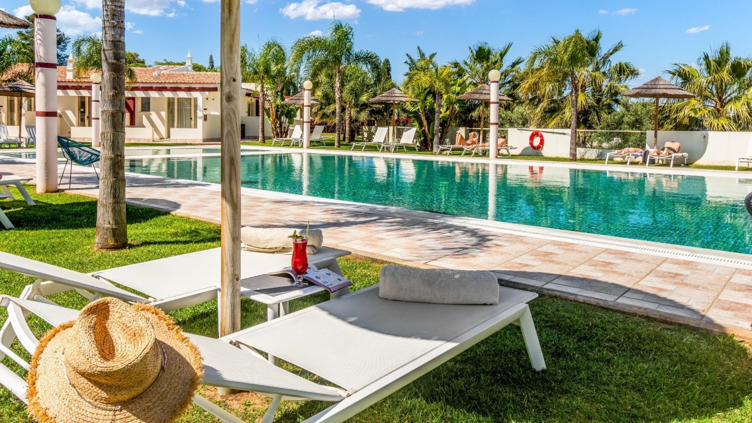 Een groot zwembad met ligbedden voor ultieme ontspanning